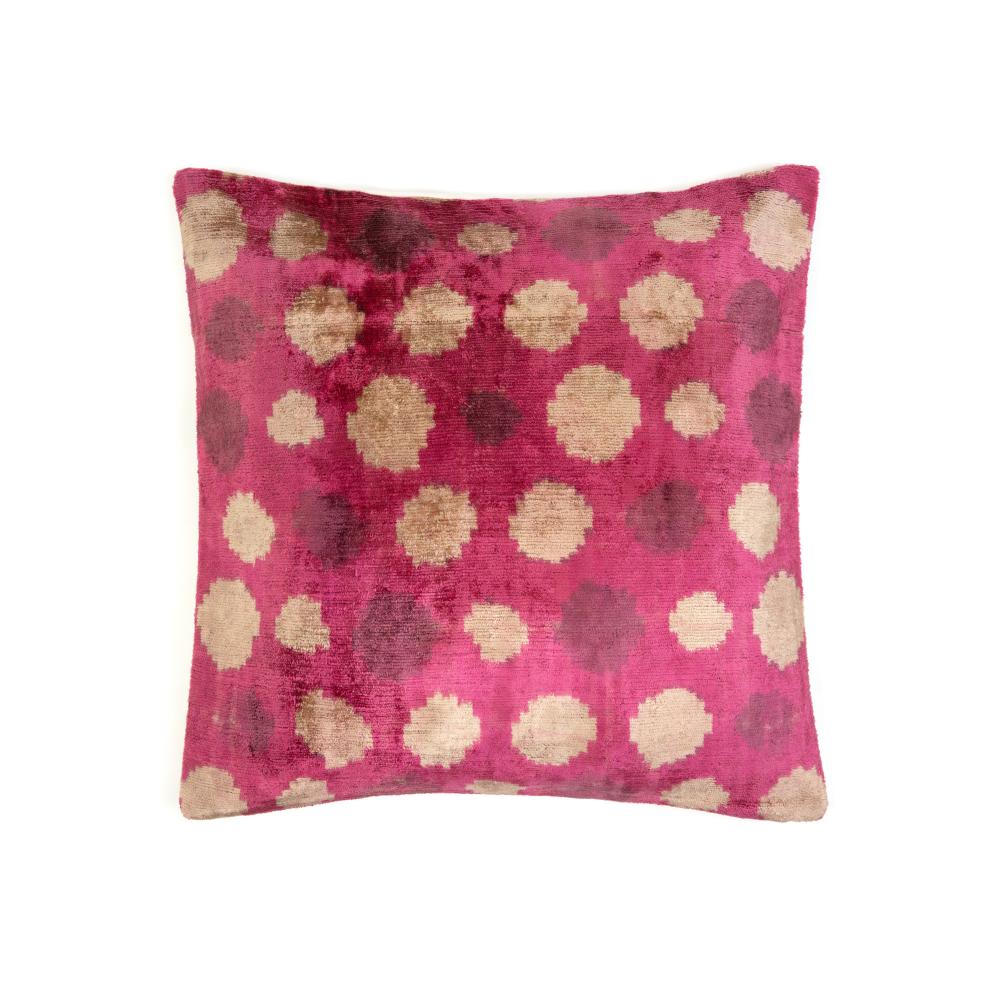 Crafted in Turkey, this vibrant, dotty silk velvet cushion cover champions Ikat design. This standout style in shades of pink, plum and beige brings a modern touch to a traditional design. Scatter on the sofa for snuggling or pair on the bed with a plain throw. This cushion cover has been hand-woven and hand dyed making it unique and one of a kind. It is one sided and backed with linen. Please note, this cushion cover does not include the pad. We recommend cushions of 50cm x 50cm for this case.