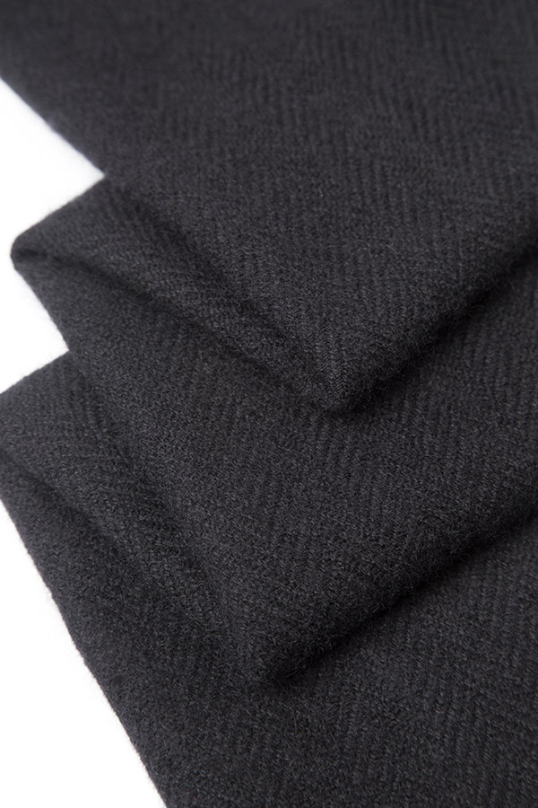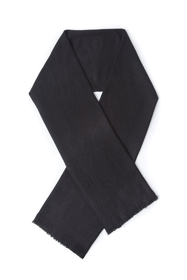 The black twill scarf in 100% cashmere, expertly handwoven, consists of a subtle pattern of diagonal parallel ribs. This piece is unisex and the fine cashmere will protect you from the winter elements. It adds understated elegance to any outfit styled over a coat or wrapped around like a blanket. Each piece takes our master weavers one month to hand create using the softest cashmere from the Changra mountain goat. The cashmere is dyed using Swiss eco-friendly colouring agents and dried in the sunshine. To maintain the softness of the cashmere, this piece is dry clean only.