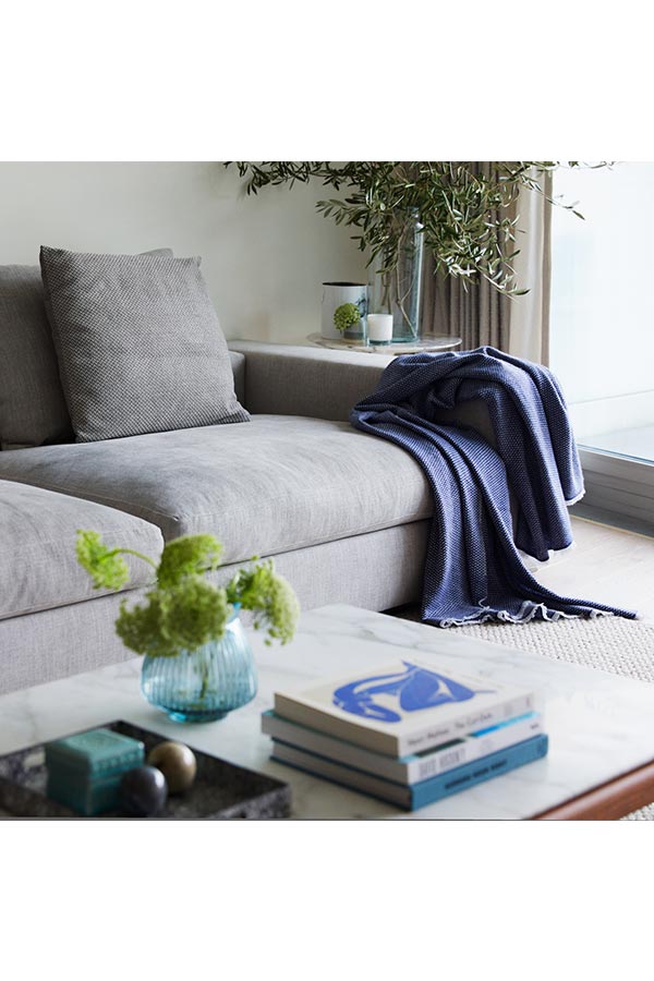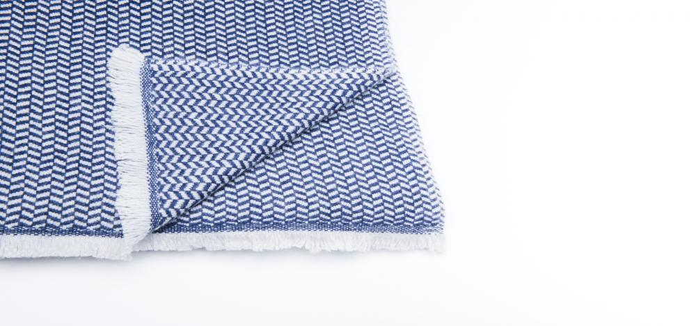 The Herringbone throw in 70% fine wool and 30% pure cashmere, skilfully handwoven, comes in a two-toned colourway of cobalt blue & off white with fringed edges making it versatile and great for adding a pop of colour when draping over furniture in the living room or as a bedroom throw. This piece is sumptuously soft and perfect for wrapping up on lazy days. Inspired by the ever-changing elements of the Himalayan landscapes, each piece takes our master weavers one month to hand create using the highest quality cashmere and wool from the Changra mountain goat. The cashmere and wool are dyed using Swiss eco-friendly colouring agents and dried in the sunshine for ultimate softness.
