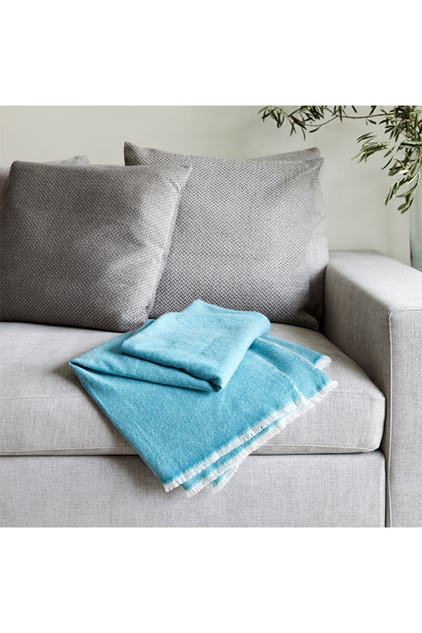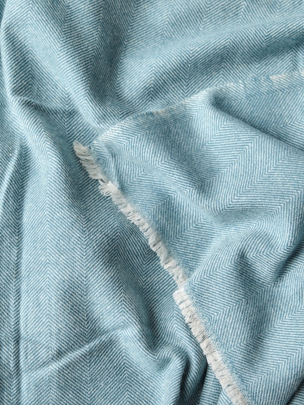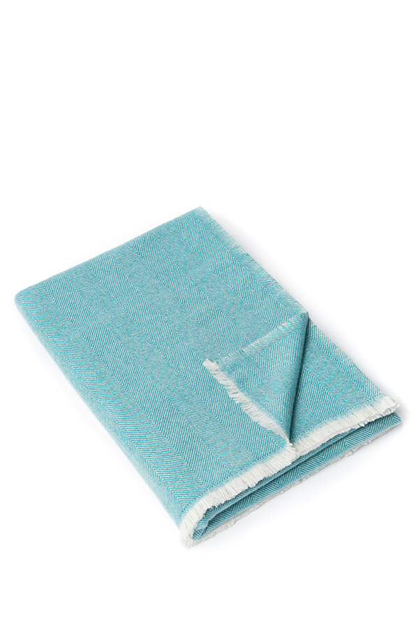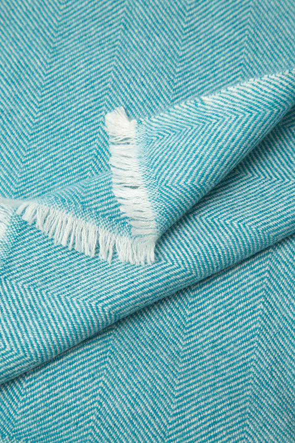 The Fishbone throw in 70% fine wool and 30% pure cashmere, skilfully handwove, comes in a two-toned colourway of aquamarine & natural white with fringed edges. The fishbone design will brighten up your home this winter with sea blue tones running throughout, adding warmth when cosying up on the sofa or when used for travelling. This piece is ultra-soft with a contemporary colour palette. Each piece takes our master weavers three months to hand create using the softest cashmere and fine wool from the Changra mountain goat. The cashmere is dyed using Swiss eco-friendly colouring agents and dried in the sunshine for ultimate softness.